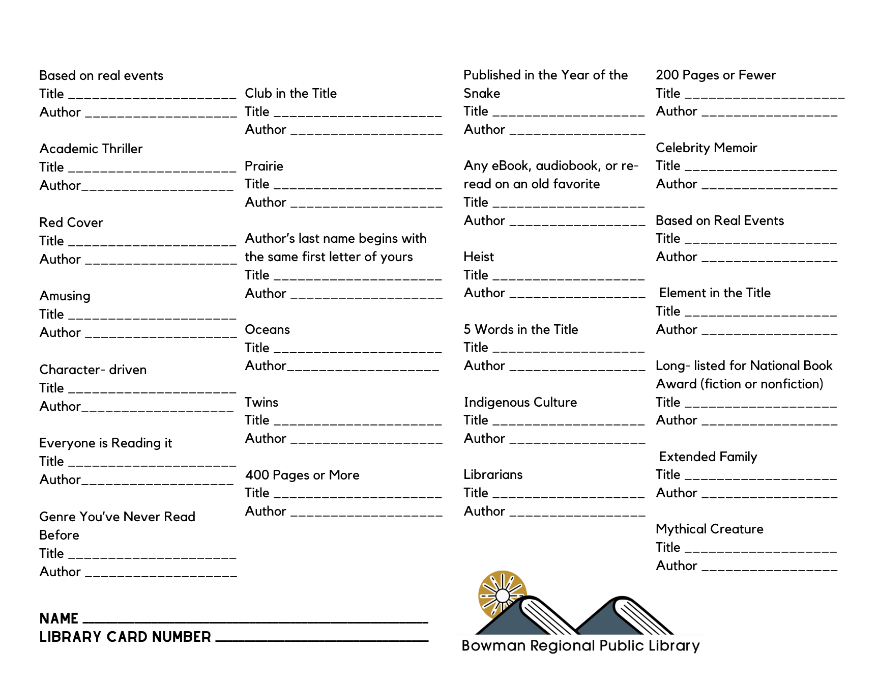 Can you read 26 books in 2026? Join us for this fun and popular book reading challenge! Read one book in each of the 26 categories by December 31, 2026, and win a fabulous prize. One book per category, one category per book, for a total of 26 books read by the end of the year. Read books from your personal library, or check out books from the BRPL - all books welcome.
