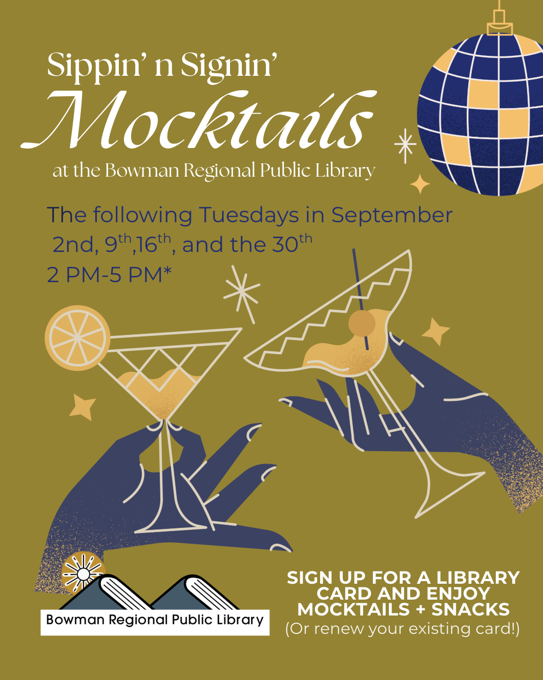 September is Library Card Sign Up Month, and we’re mixing up some fun with Mocktails! Swing by the Library on Tuesdays this September, sip on our delightful non-alcoholic concoctions, and snag yourself a Library card. Already a cardholder? Perfect time to renew and ensure your details are spot on. Mocktail magic happens from 2 to 5 PM each Tuesday.